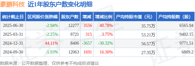 从股价来看,2025年3月31日至2025年6月30日,豪鹏科技区间跌幅为2.94%,在此期间股东户数增加3556.0户,增幅为40.78%。